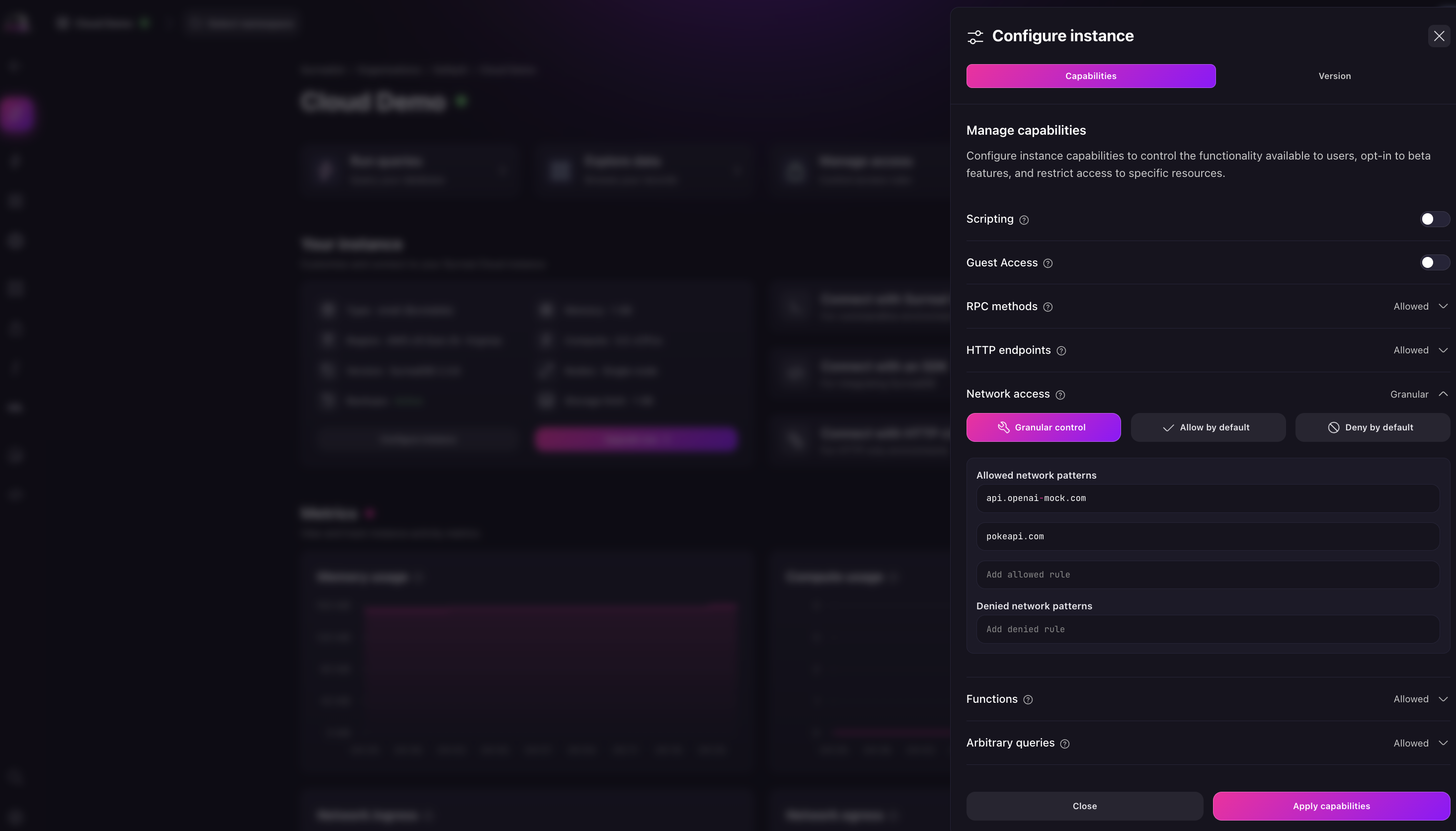 Network access is a type of Instance capability that allows you to control and manage how your SurrealDB Cloud Instance connects to external services and networks through HTTP functions and requests. This capability enables you to make HTTP calls to external APIs and services directly from your database queries while maintaining control over which endpoints can be accessed.