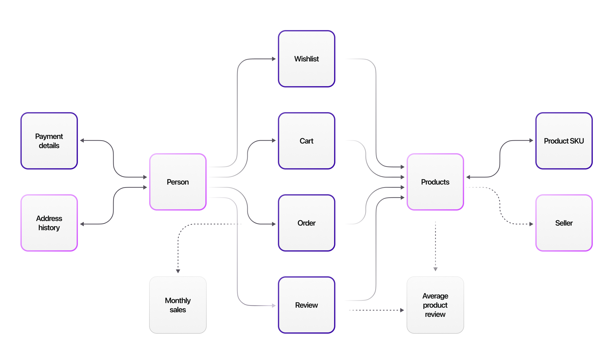 In the diagram below, the nodes in pink are the standard tables, the ones in purple represent the edge tables which shows relationships between records and SurrealDB as a graph database. The nodes in grey are the pre-computed table views.